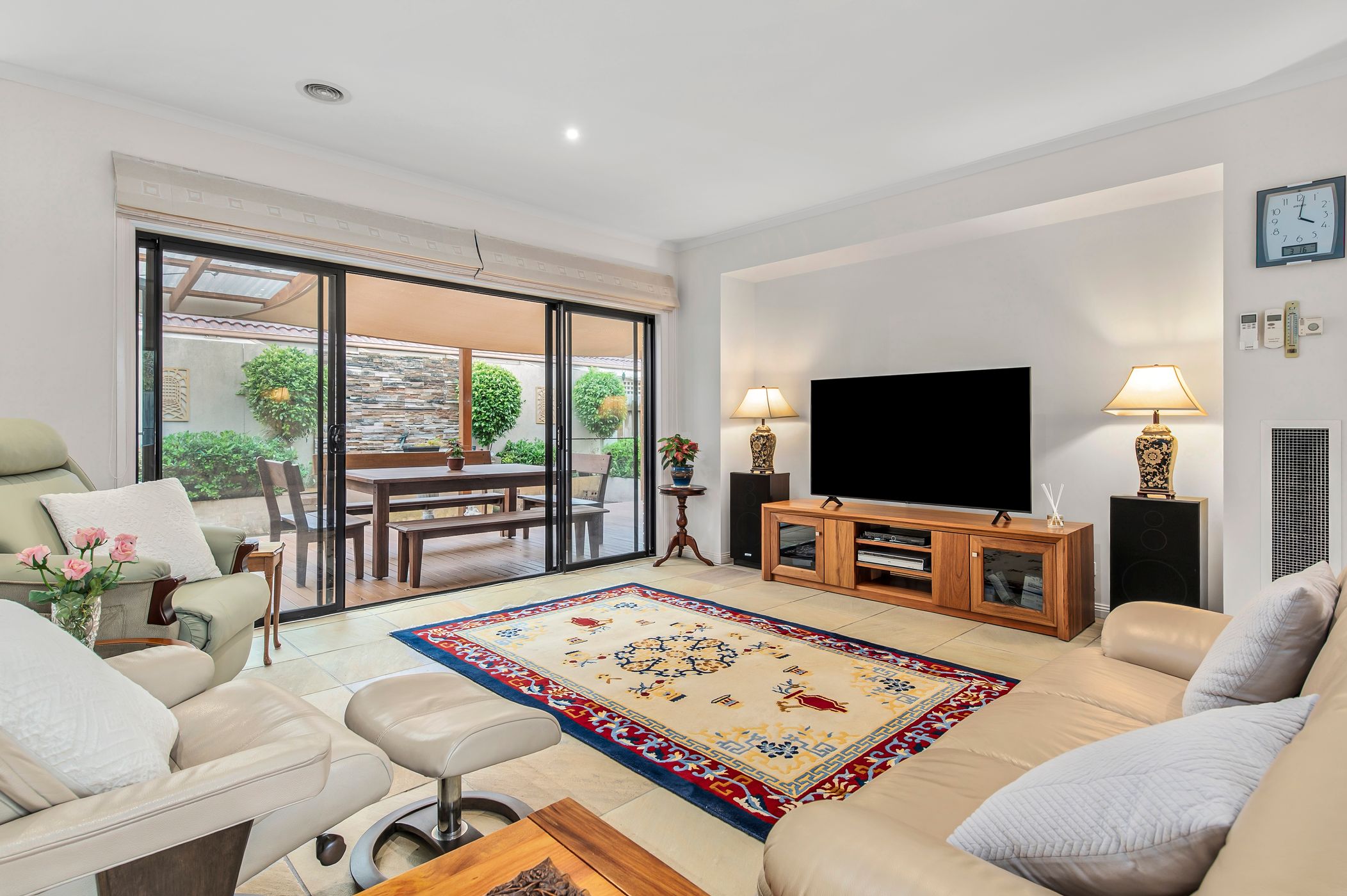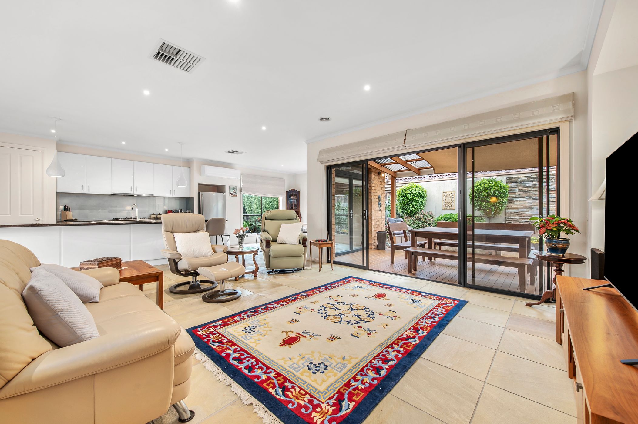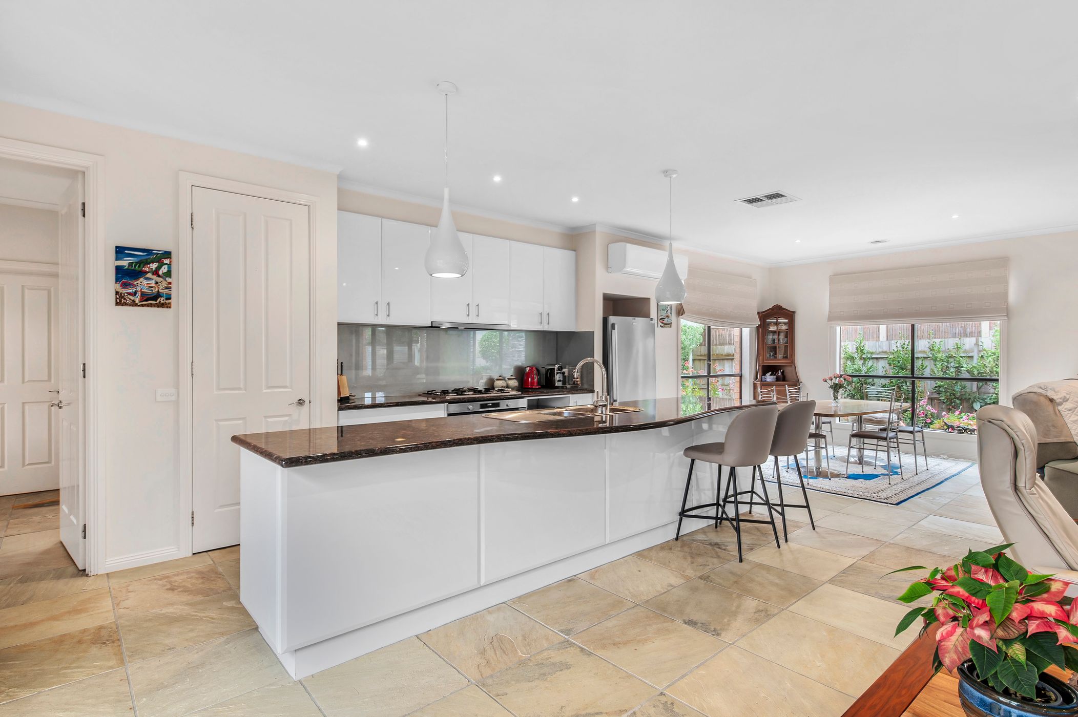 Step inside to discover a light-filled interior enhanced by impressive 2.7m ceilings and striking sandstone flooring flowing through the hall, kitchen, living and dining zones. Multiple living areas provide flexibility for families and entertainers alike, including a welcoming front lounge and formal dining space with louvre blinds and a cosy gas fireplace. At the heart of the home, the large kitchen features a walk-in pantry, new 900mm oven and abundant storage, overlooking the main living and dining areas. Year-round comfort is ensured with gas ducted heating, evaporative cooling and an additional split system.