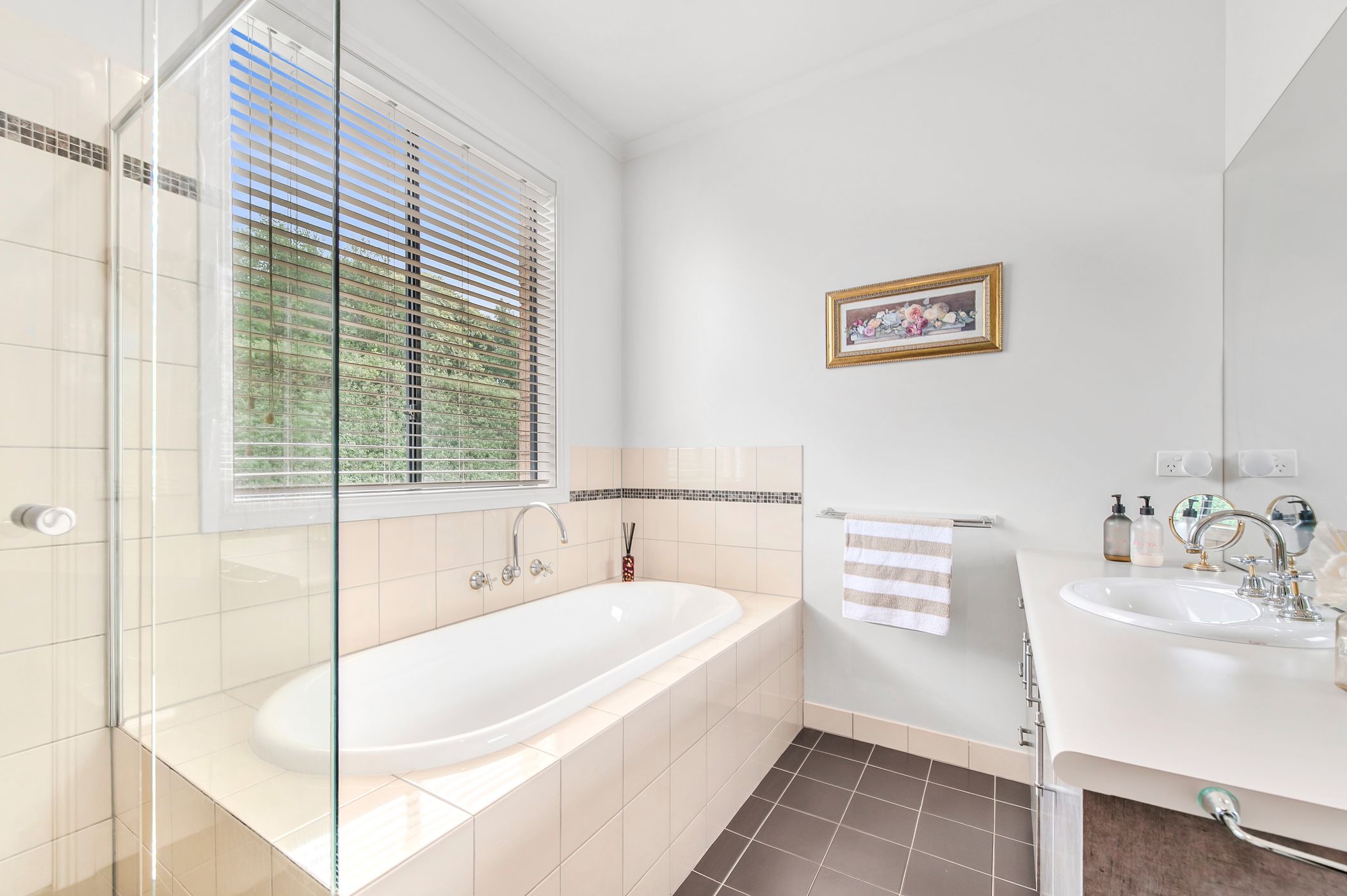 Outdoors, the home continues to impress with beautifully established gardens visible from almost every room. A large covered deck flowing from the kitchen and living area creates an inviting space for entertaining or relaxing amongst the flowers. Completing the package is an oversized double garage, plentiful storage throughout the home and ample off-street parking for additional vehicles, boats or trailers.