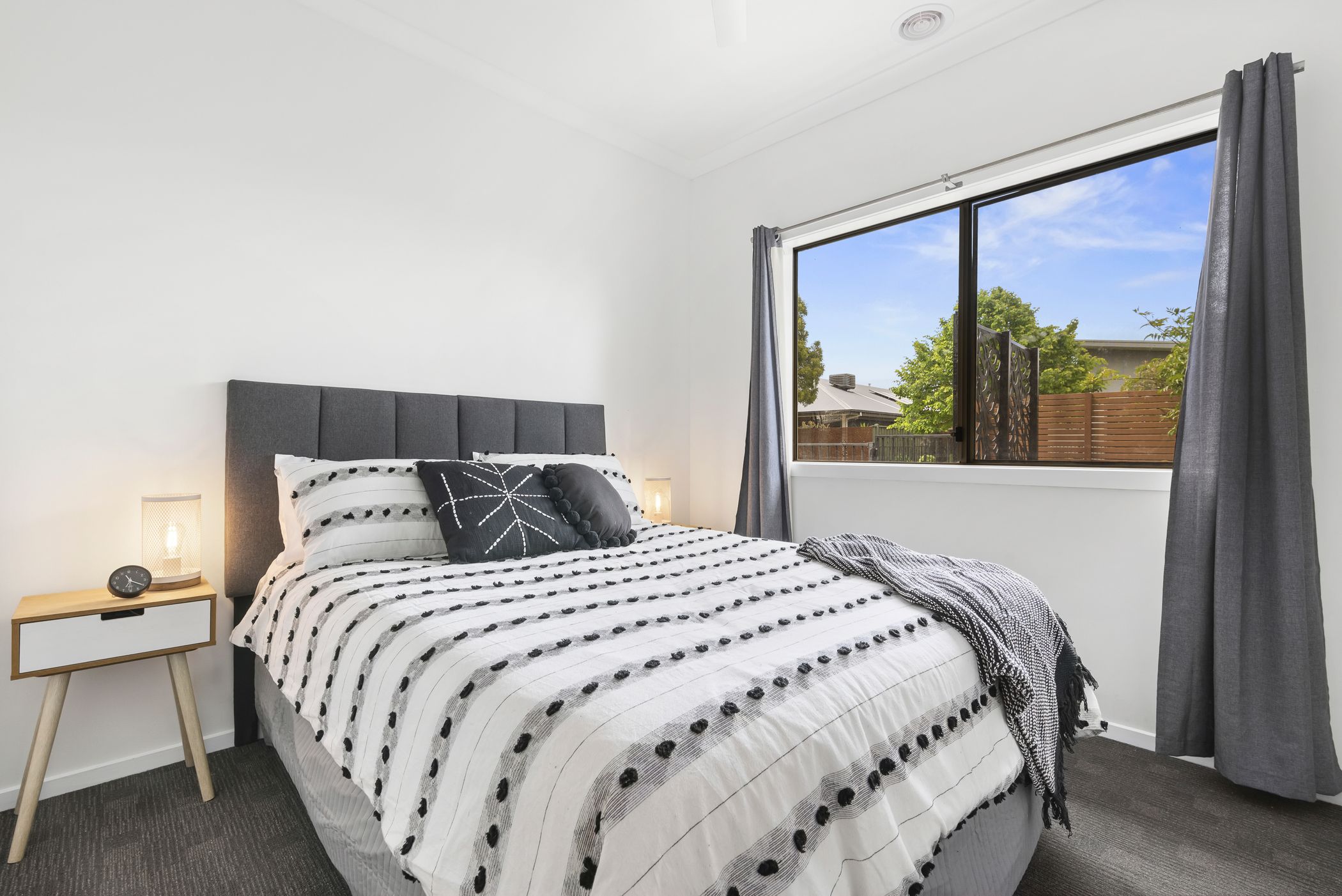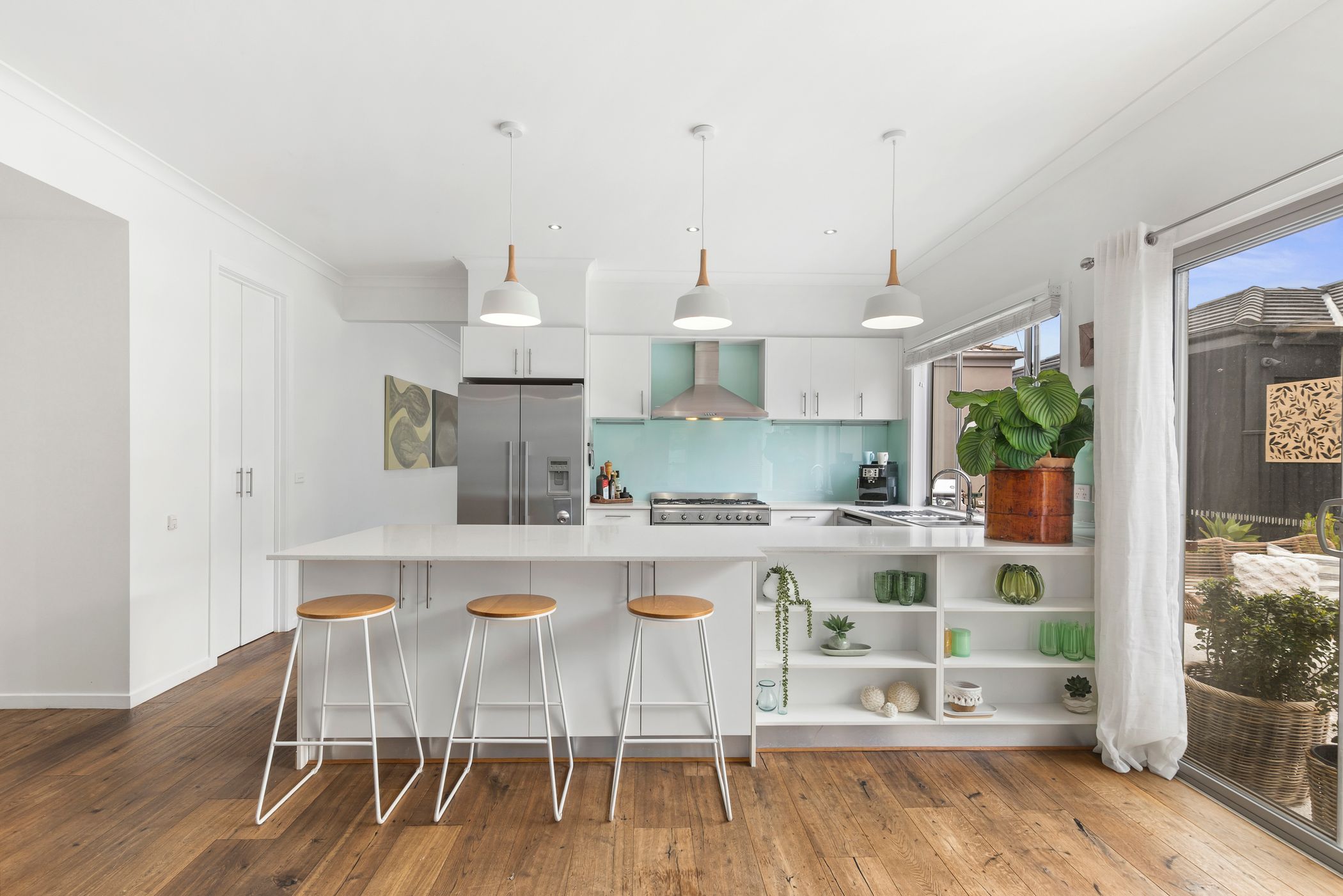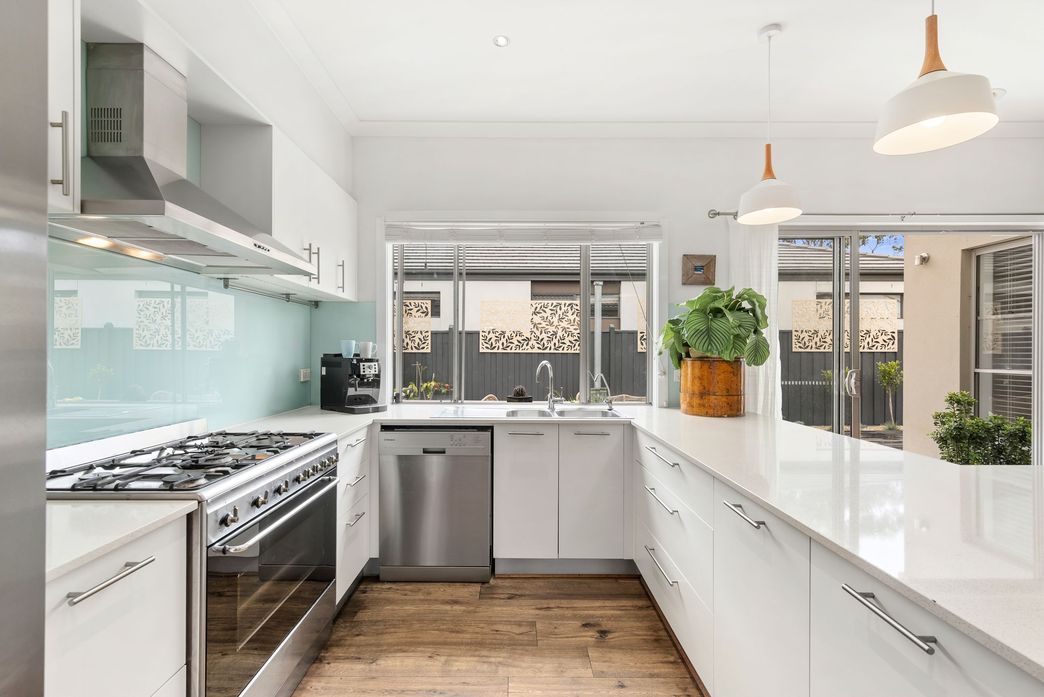 The light-filled interiors unfold around a generous central living zone, creating a welcoming hub for family life and entertaining. The well-appointed kitchen is thoughtfully designed with a 900mm freestanding oven with gas cooktop and canopy rangehood, ample cabinetry and excellent storage, making everyday living a pleasure. A servery window opens to a timber bar and outdoor entertaining area, seamlessly connecting indoor and outdoor spaces.