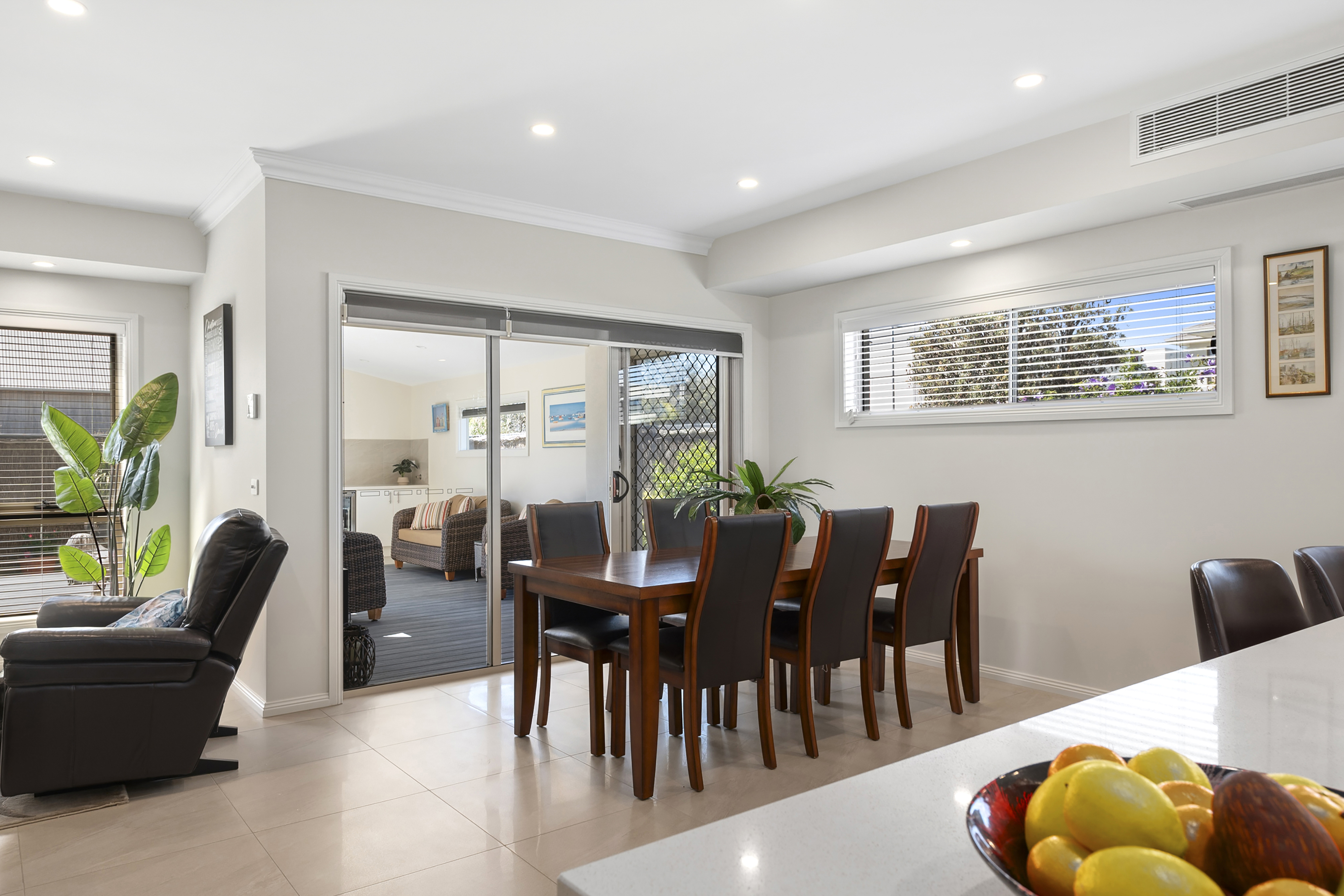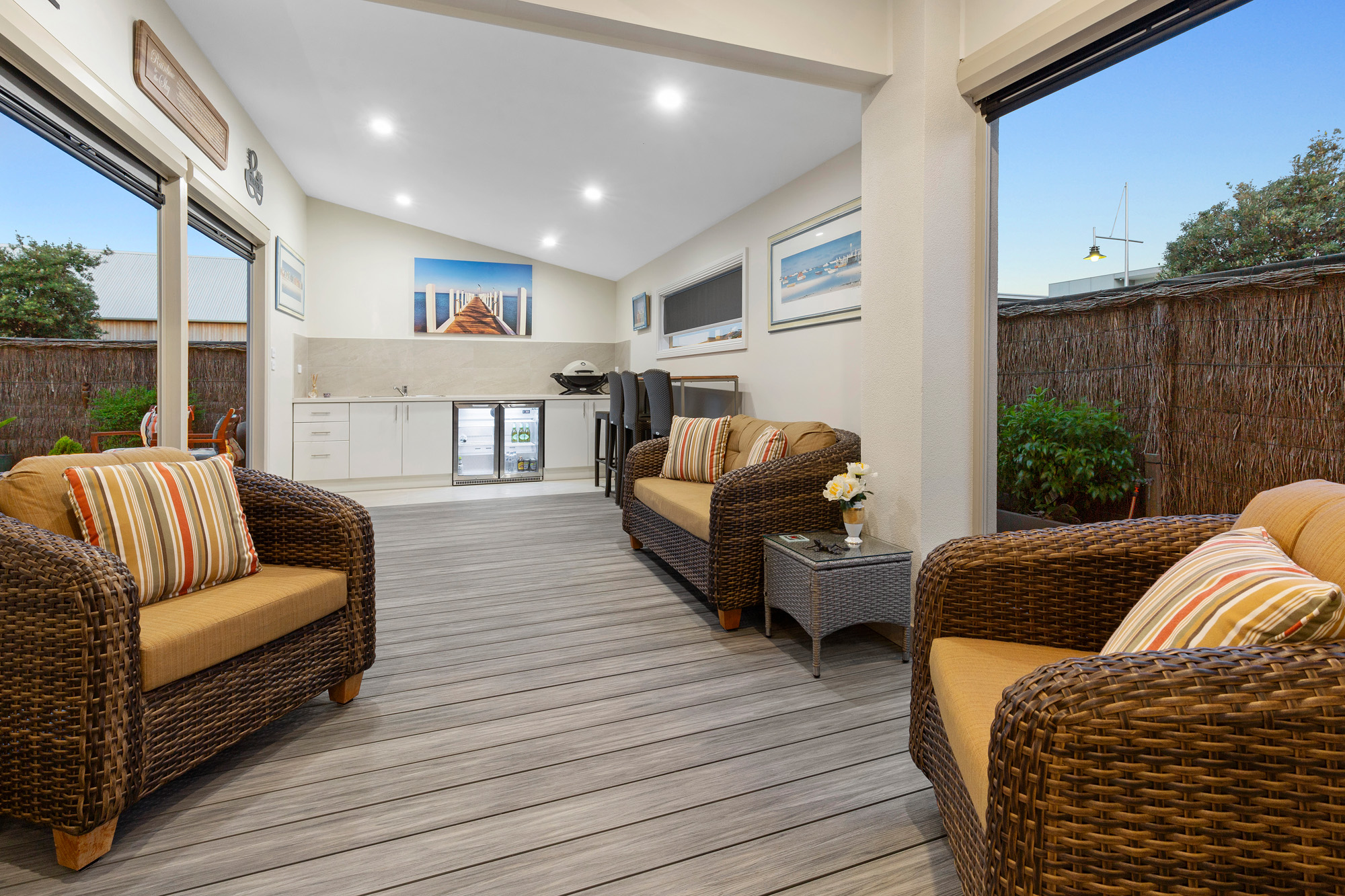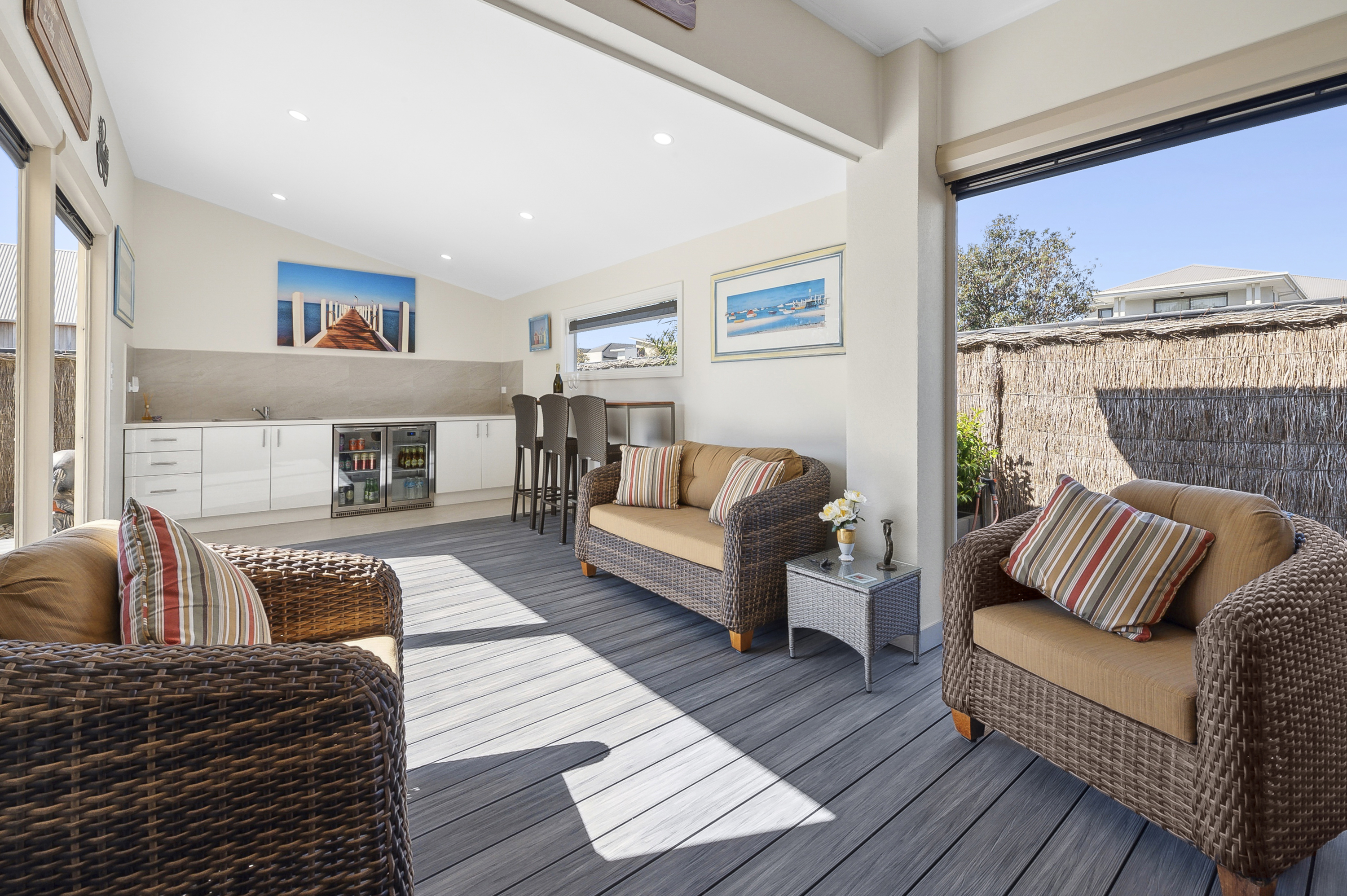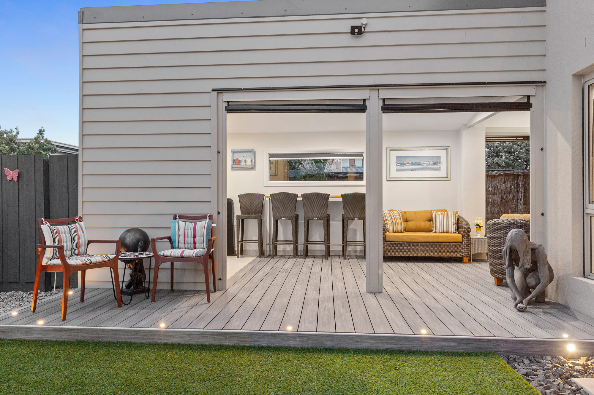 The home’s contemporary design delivers both sophistication and comfort, with light-filled interiors, high ceilings, and a seamless connection between indoor and outdoor spaces. The open-plan living and dining area extends to a beautifully appointed alfresco zone, complete with kitchenette, café blinds, and composite decking, perfect for relaxed entertaining in every season.