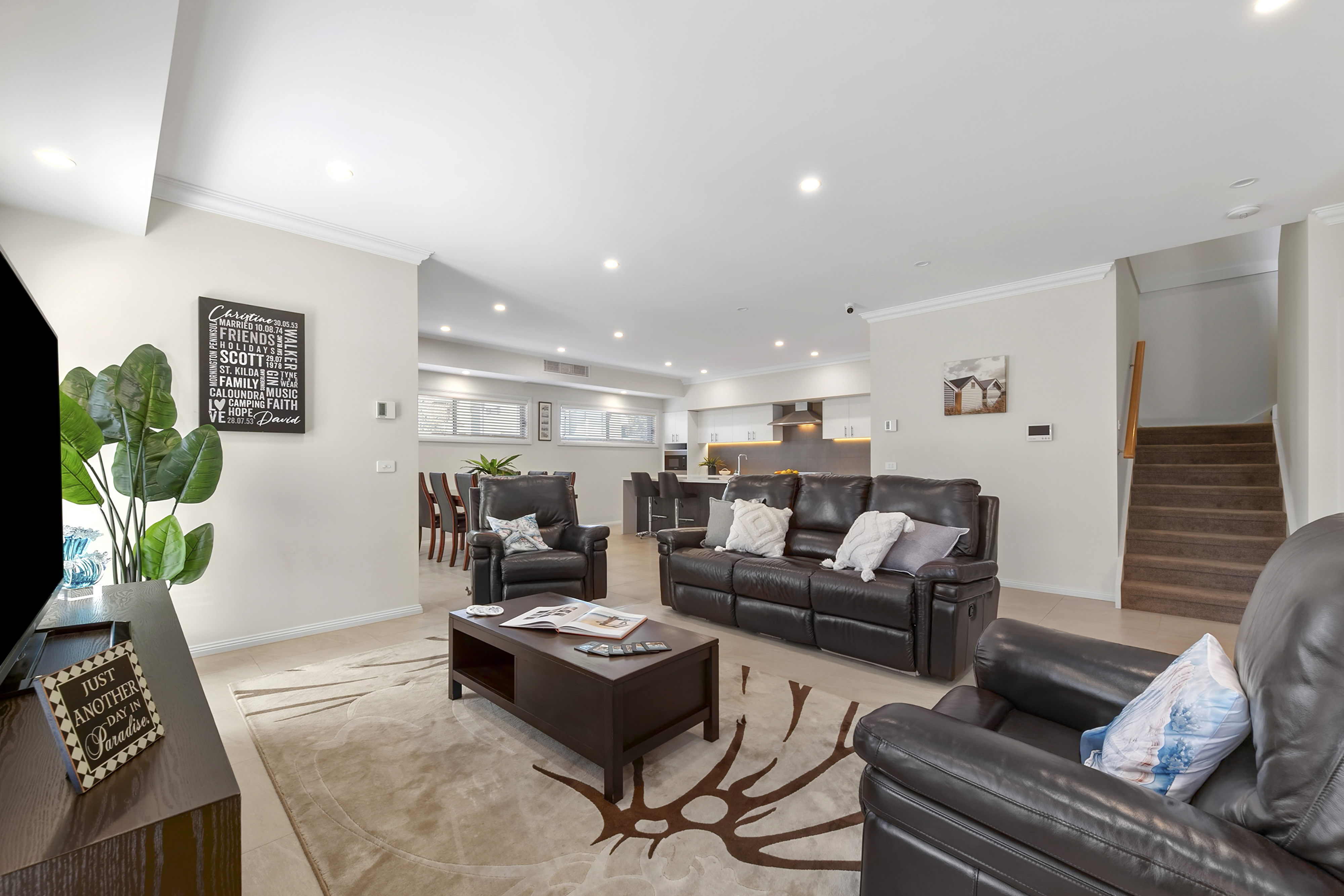 A striking kitchen forms the centrepiece of the home, featuring sleek stone benchtops, premium Westinghouse appliances, and a generous walk-in pantry. On the ground floor, a versatile fourth bedroom offers the ideal space for guests seeking privacy or can be easily transformed into an entertainment or theatre room to suit your lifestyle. Upstairs, a retreat with its own bar, kitchenette, and private balcony provides a peaceful haven to unwind.