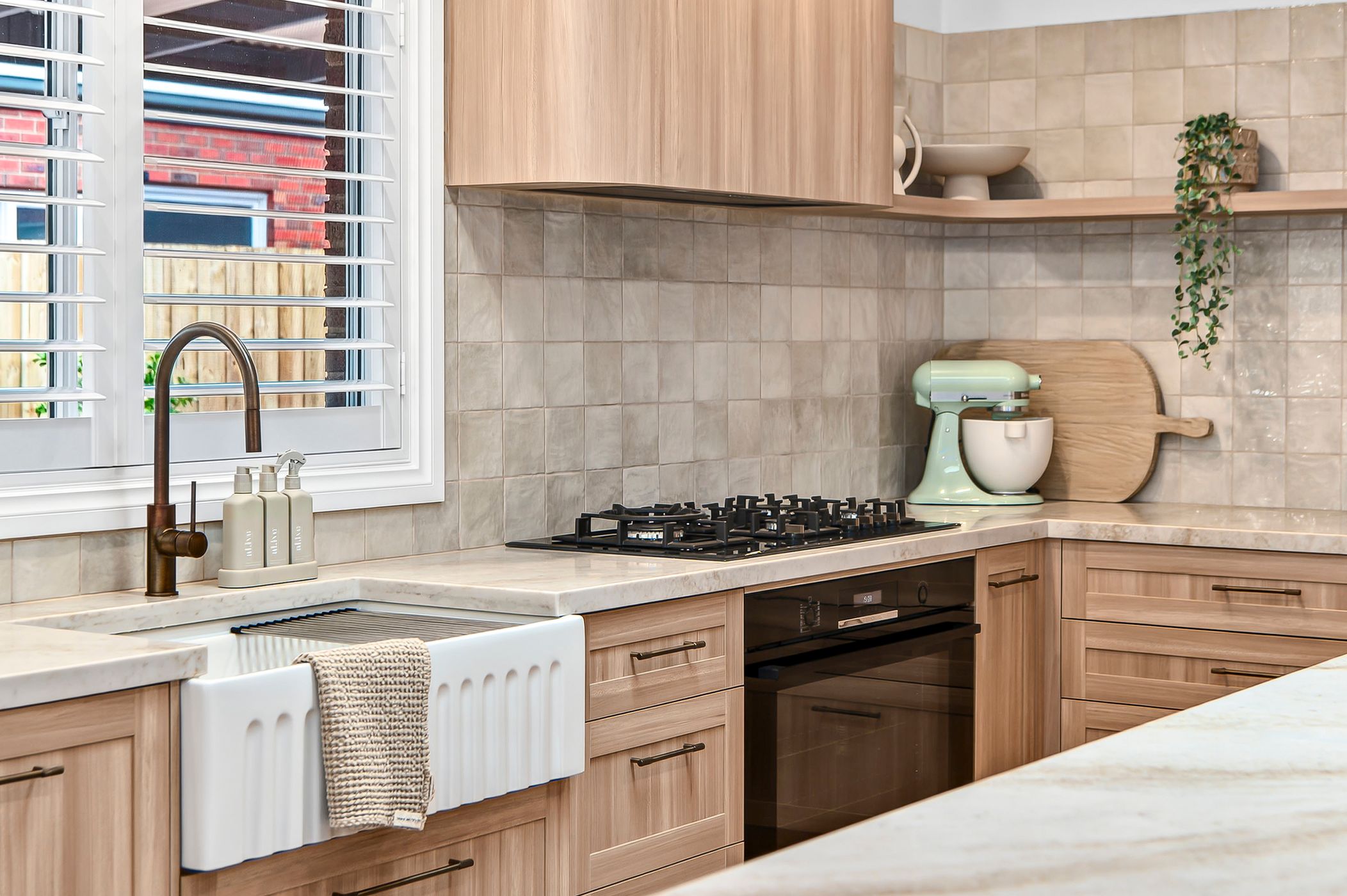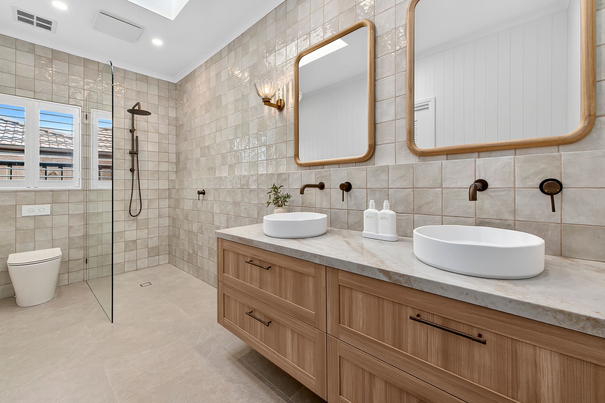 At the heart of the home lies a true Hamptons showpiece: the kitchen and adjoining butler’s pantry. Mahal Ivory YDL Stone benchtops, farmhouse sinks, antique brass tapware, and custom cabinetry combine with Spanish tiled splashbacks and a curved rangehood to create a space that is both functional and beautifully styled. A suite of premium Bosch appliances, including a 900mm oven, hotplate, and fully integrated dishwasher, ensure everyday ease, while Velux skylights in the kitchen and butler’s pantry flood the space with soft, natural light.