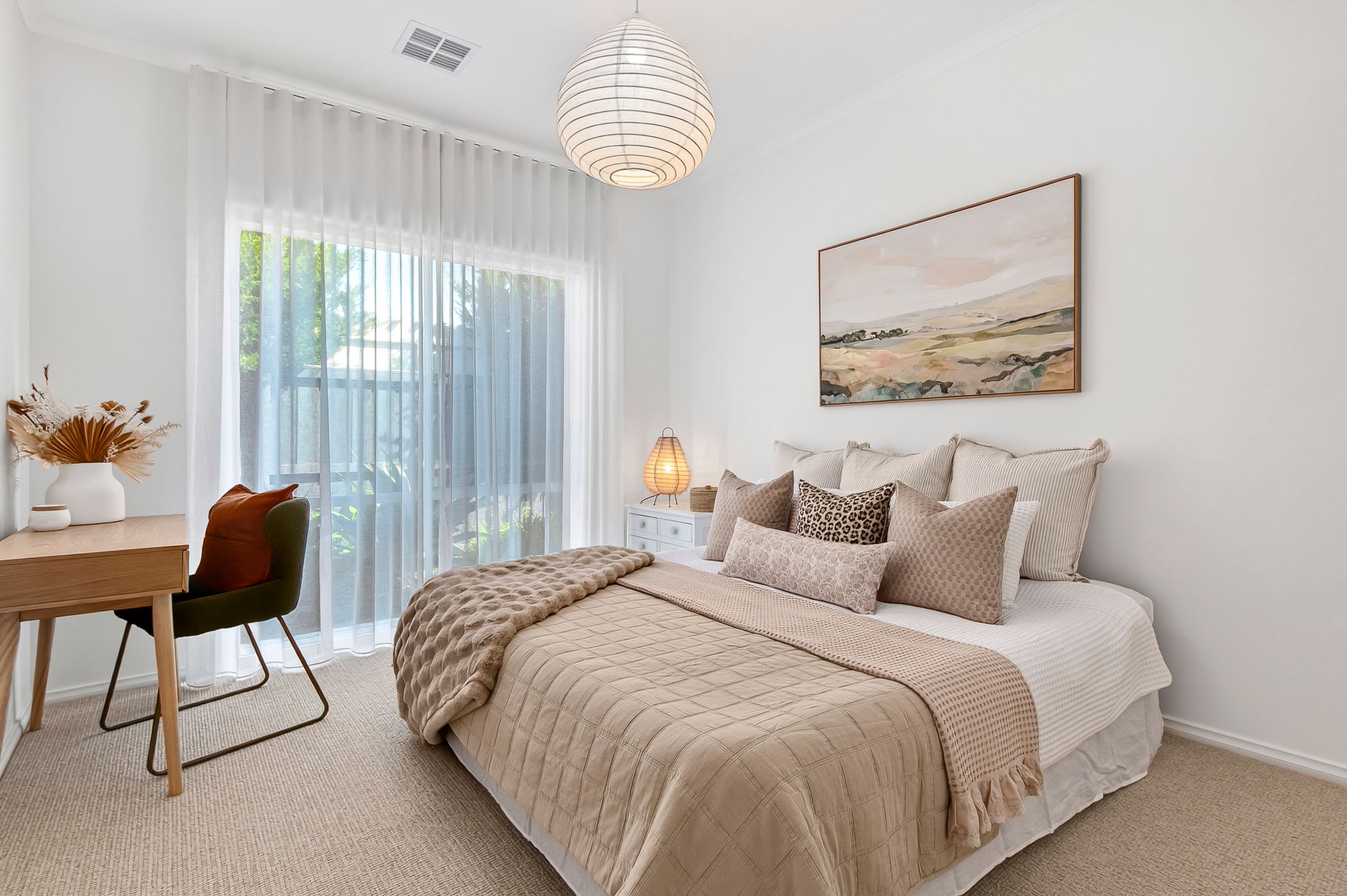 Inside, the home offers four generous bedrooms, a dedicated study, and two beautifully appointed bathrooms, ideal for families or multi-generational living. The master bedroom enjoys tranquil, uninterrupted views across the golf course and features a custom-built robe. The adjoining ensuite continues the theme of elegance, with premium finishes and a Velux skylight that bathes the space in natural light.