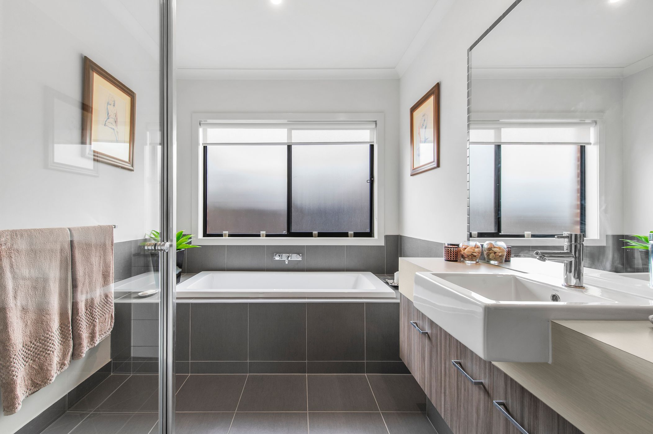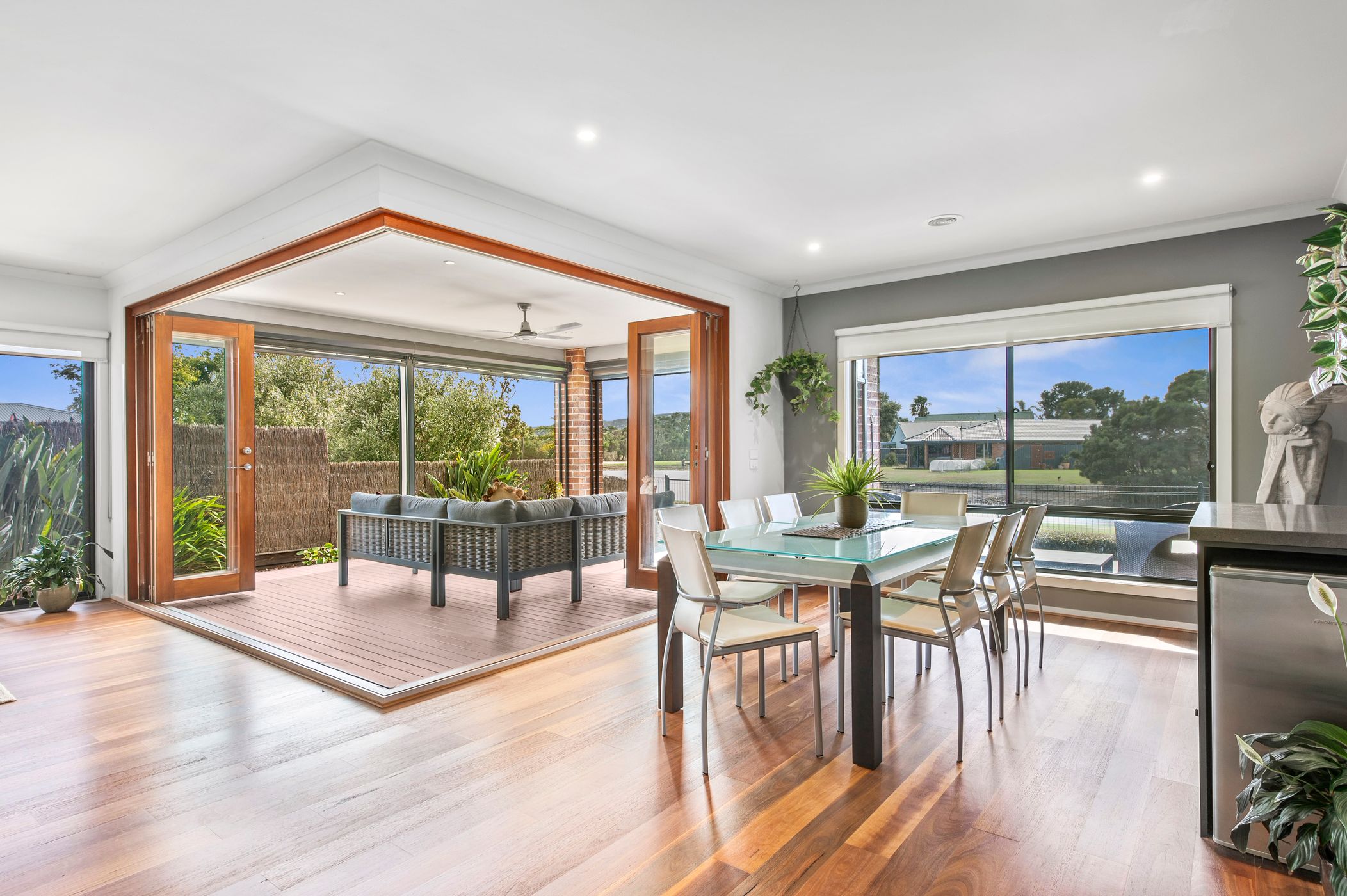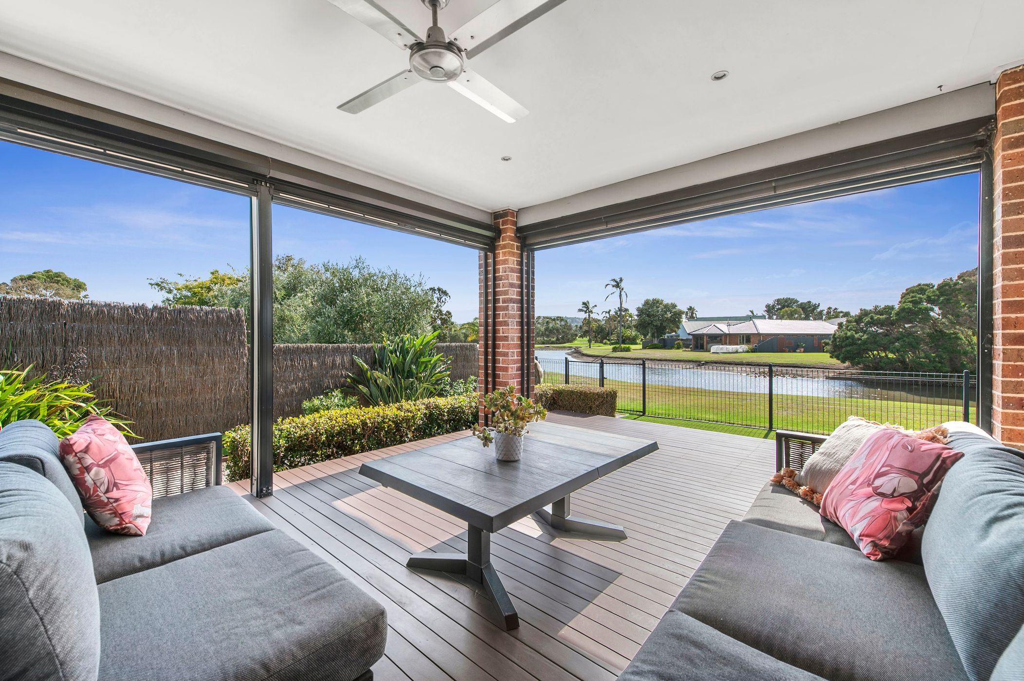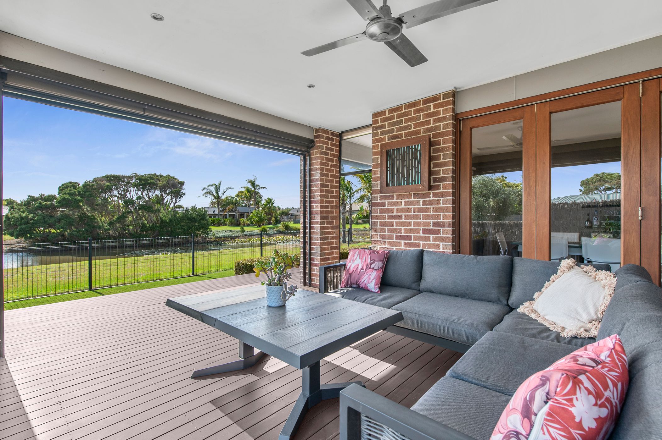 Stacking doors create a seamless connection to the outdoor deck, where stunning lake views form the backdrop to year-round entertaining. Fitted with PVC and shade blinds, as well as awnings, this space adapts effortlessly to every season—whether it’s long summer evenings or relaxed winter afternoons.