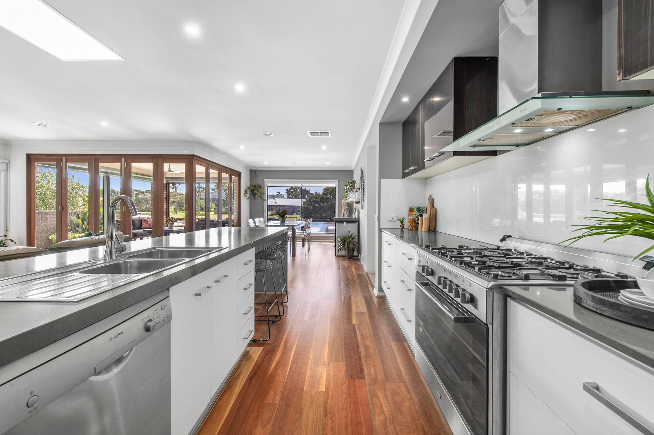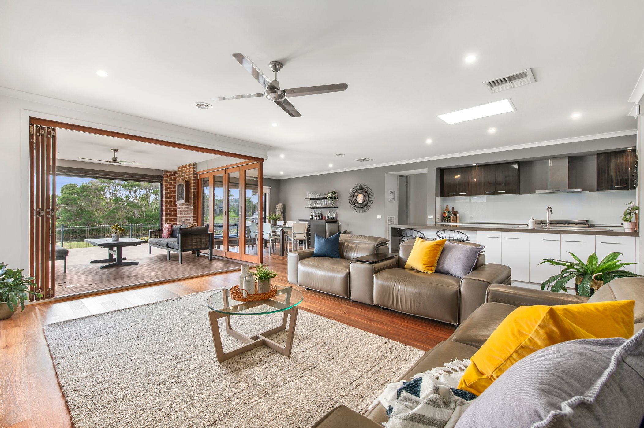 From the moment you step inside, the warmth of blackbutt timber floors sets the tone, guiding you through a thoughtfully designed layout that balances everyday comfort with impressive entertaining credentials. At the heart of the home, a generous open-plan living and dining domain is anchored by a large, well-appointed kitchen complete with butler’s pantry—perfect for hosting or family living alike.