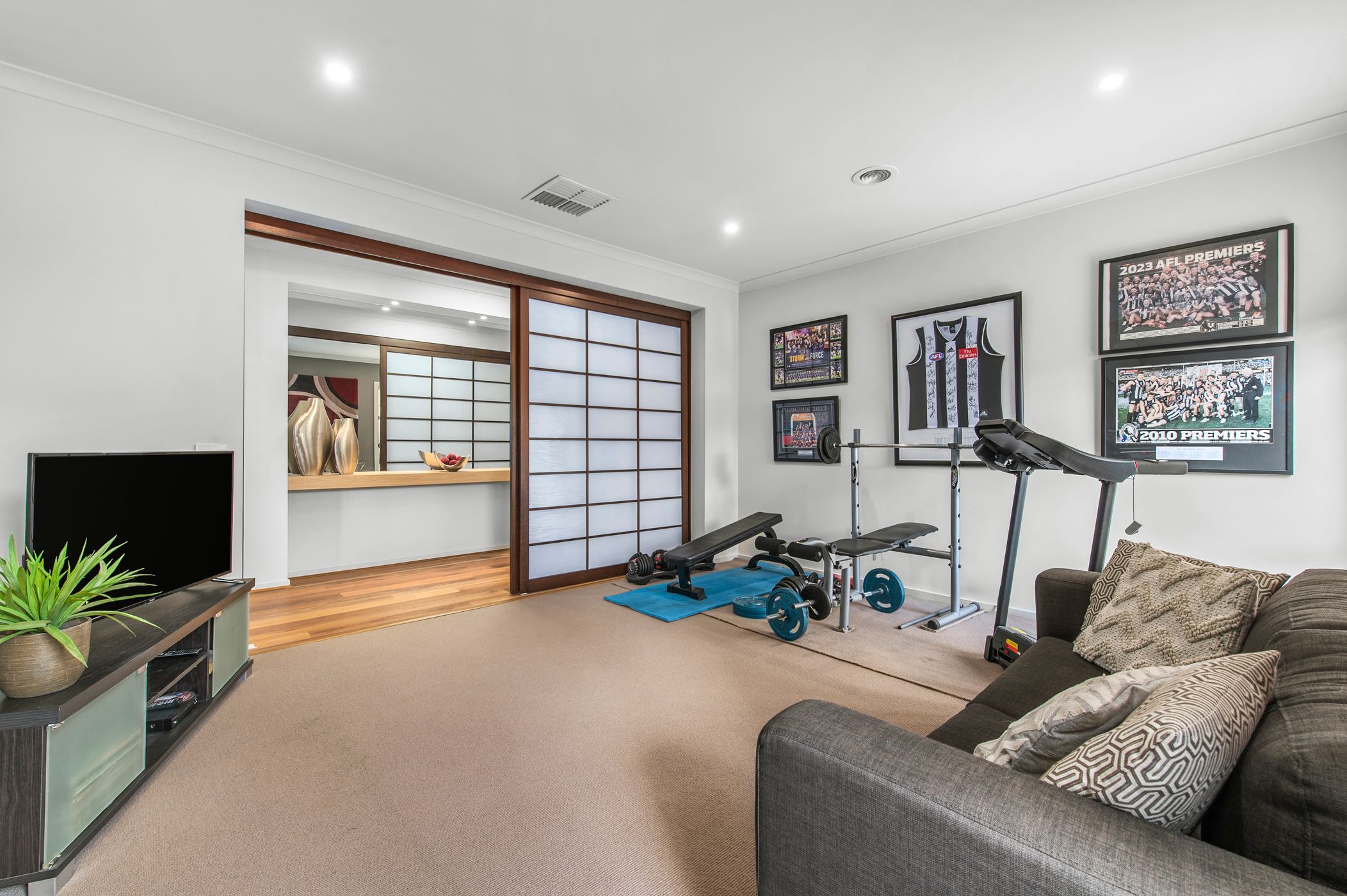 A separate rumpus or cinema room—enhanced by striking Japanese screen sliding doors—offers further versatility, ideal as a third living zone, home theatre or private retreat.